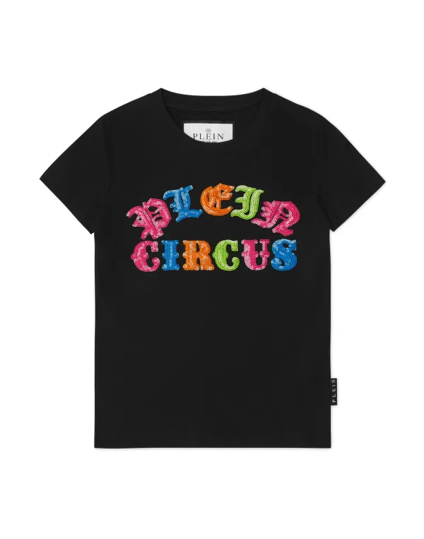 Ontdek de details van dit katoenen T-shirt. Katoenen jersey Multicolor pailletten Merk PP Hexagon op een saffiaan lederen patch is genaaid op het juk Ribgebreide hals Twee naaldstiksels