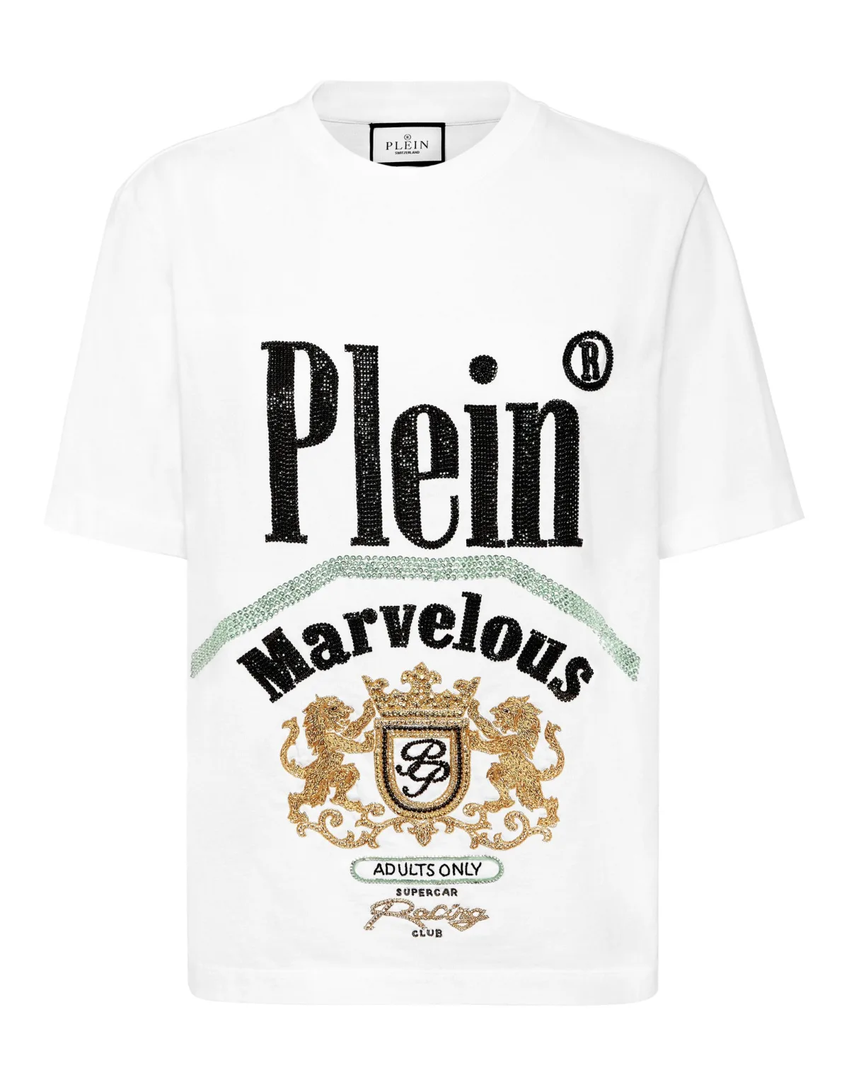 Innovation and luxury are the key elements of this T-shirt. Look at the details. Cotton jersey Bejeweled prints Logoed patch sewn on the yoke Rib knit neckline Two needle stitching Fit: Man