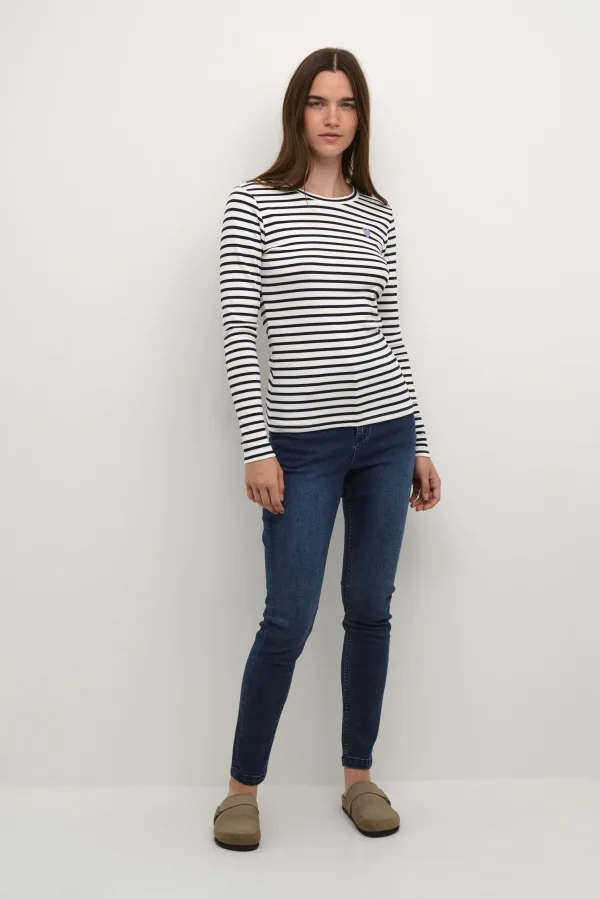 Ons T-shirt KAliddy is een basic T-shirt met lange mouwen en een Parijse flair. Het heeft smalle horizontale strepen en aan de linkerzijde bevindt zich een mooi geborduurd hart. Het T-shirt is gemaakt van zachte en rekbare jersey, en het heeft een slim fit. Snit: Regular fit Mouwen: Lange mouwen Stofsamenstelling: 45% polyester, 25% katoen, 25% viscose, 5% elastaan
