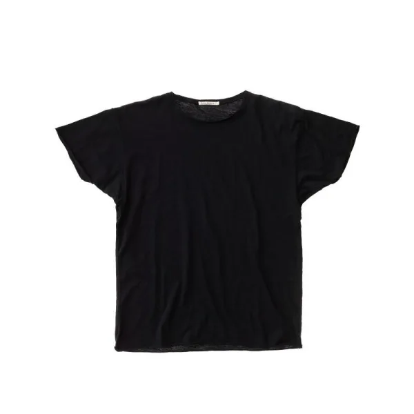 T-shirt met korte mouwen in het zwart.Kenmerken:Slubconstructie heeft dikkere garens in sommige gebieden dan in andere.Ruwe rolafwerking aan de zoom en de mouwen.Iets wijdere ronde halslijn.Materiaal: 100% biologisch katoen.Maten: Dit kledingstuk is een normale maat