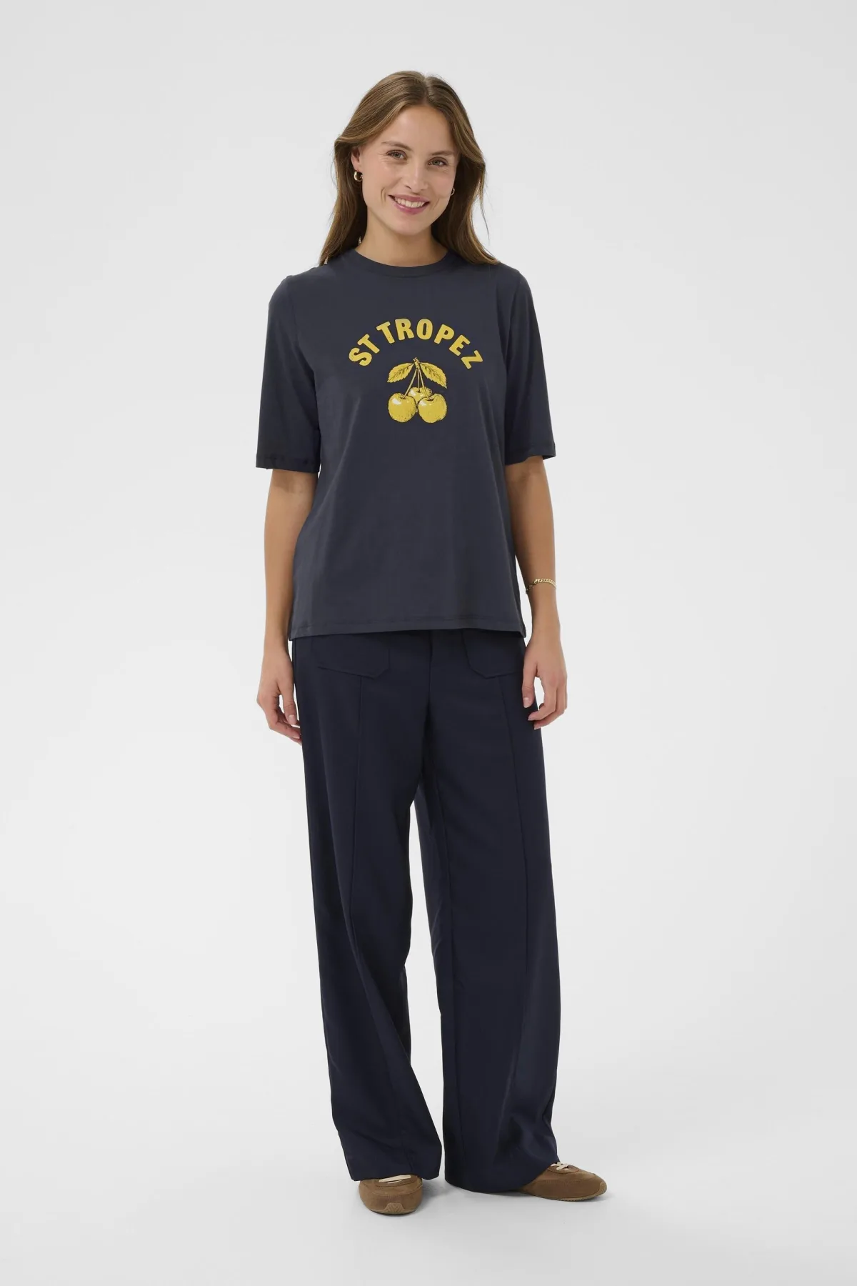 Dit dames T-shirt heeft een ontspannen pasvorm, ronde hals en korte mouwen. Het comfortabele ontwerp maakt het geschikt voor dagelijks gebruik en gemakkelijk te combineren met een rok of jeans.