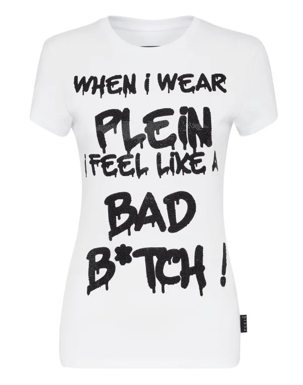 Verfraaid Je hebt maar één statement nodig om van een T-shirt een must-have te maken. Wij raden dit T-shirt uit de Sexy Pure lijn aan. Het is gemaakt van katoenen jersey en heeft een opvallende print met strassteentjes en de saffiaanleren patch met de PP Hexagon op het passtuk genaaid. Zomen gestikt met twee naalden.