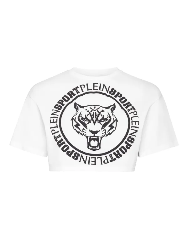 Plein Sport gives you the chance to stand out also while training hard. Check out this new crop T-shirt featuring printed inserts. Maximum comfort thanks to the natural flexibility of stretch cotton jersey Lettering and Tiger print on the front Rib knit neckline Raw cut bottom hem