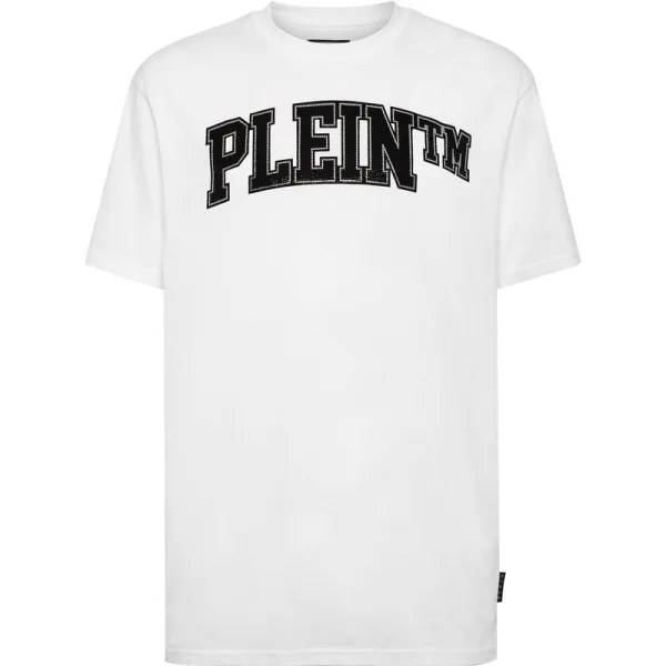 Verfraaid Kijk hoe dit katoenen jersey crewneck T-shirt wordt opgeschud. Het kledingstuk is voorzien van de iconische Brand print met strass-applicaties. Een saffiaanleren patch met de PP Hexagon is op het juk genaaid. De zomen zijn gestikt met twee naalden.
