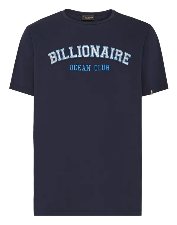 Navy is this season’s trend. See our version of it on this cotton jersey T-shirt with unique and distinctive details. Cotton jersey Themed lettering embroidered on the front The iconic Crest on a stud applied on the hang loop sewn on the back of neckline Rib knit neckline Two needle stitching hems