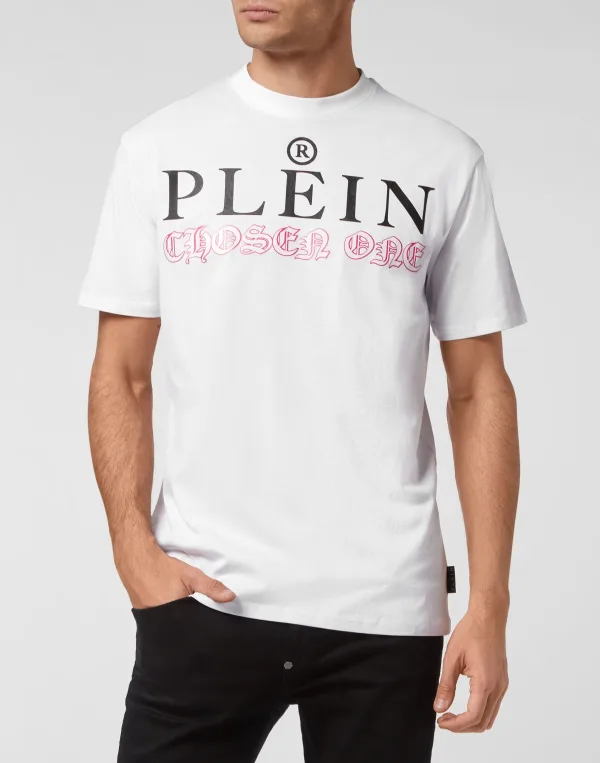 Kijk hoe dit katoenen jersey crewneck T-shirt wordt opgeschud. Het kledingstuk heeft de iconische Brand print en een brutaal statement in de zuiverste Plein-stijl. Een saffiaanleren patch met de PP Hexagon is op het juk genaaid. De zomen zijn gestikt met twee naalden.