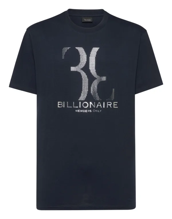 Billionaire geeft zijn iconische monogram niet op. Op dit T-shirt van katoenen jersey staat het op de voorkant met mini-studs en gelamineerde letters. Het embleem van het huis is gedrukt op het juk. Geribde halslijn. Manchetten en onderkant gestikt met twee naalden.