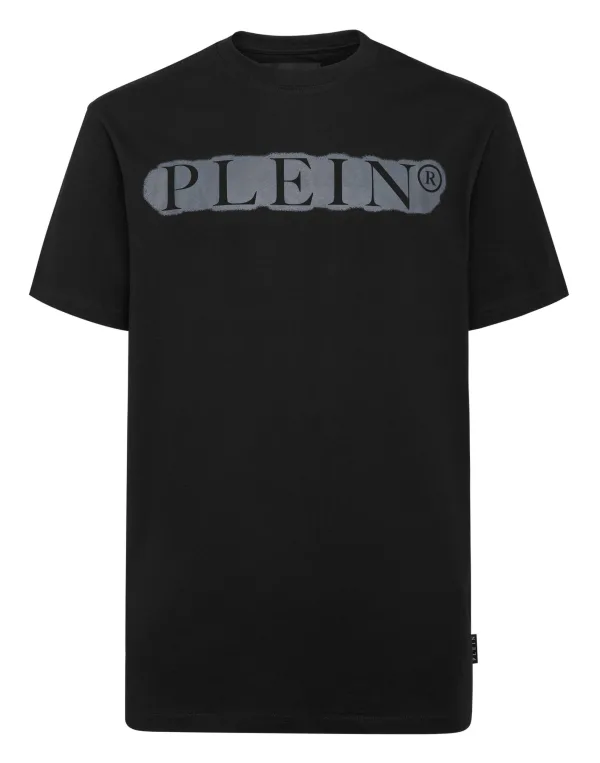 Katoenen T-shirt van jersey met een opdruk met spray-effect van de merkbelettering. Een saffiaanleren patch met de PP Hexagon is op het juk genaaid. Gestikt met twee naalden.