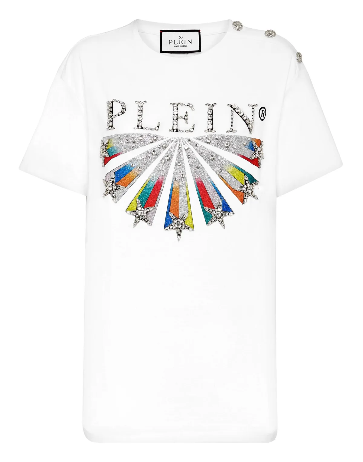 Verfraaid Een ontwerpdetail. Kijk hoe dit T-shirt van katoenen jersey nieuw leven wordt ingeblazen door prints, strassteentjes en gemonteerde strassteentjes. Drie juweelknopen zijn op de linkerschouder genaaid en de saffiaanleren patch met de PP Hexagon is op het juk genaaid. Zomen gestikt met twee naalden.