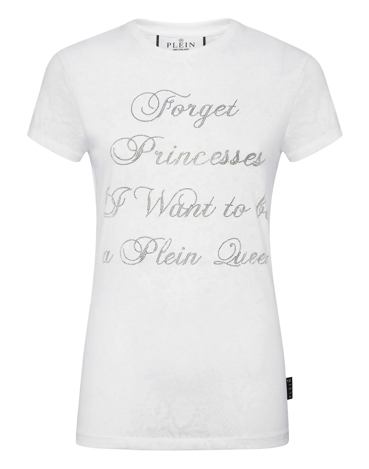 Verfraaid Een ontwerpdetail. Kijk hoe het dit katoenen jersey crewneck T-shirt nieuw leven inblaast. Ontdek hoe je een echte koningin kunt zijn. Katoenen tricot en polyester met pythonhuideffect op devoré Bedrukking met juwelen in themaletters op de voorkant PP Hexagon op een patch van saffiaanleer die op het juk is genaaid Ribgebreide hals Stiksels met twee naalden