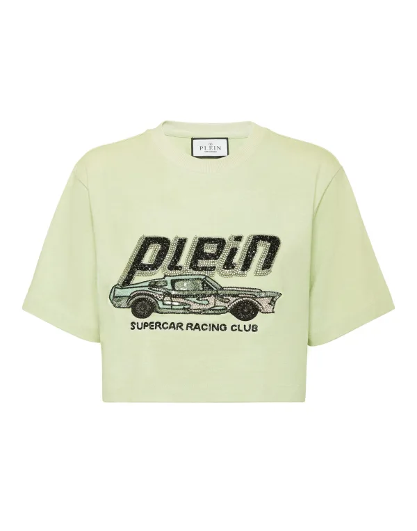 Add a sexy touch to your day and your look.. Check out this cotton jersey crop T-shirt. Cotton jersey Bejeweled, sequined pattern print on the front Rib knit neckline Two needle stitching Fit: Cropped