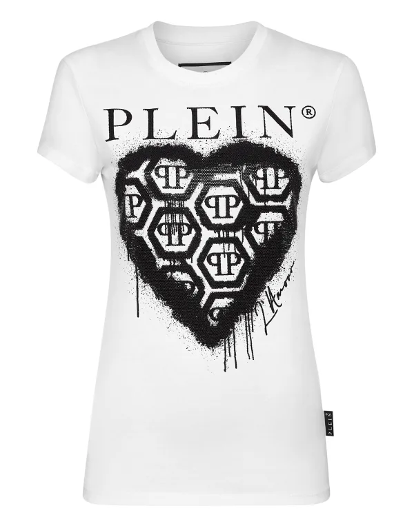 Verfraaid Er is niet veel voor nodig om van een T-shirt een must-have te maken. Wij raden dit T-shirt uit de Sexy Pure lijn aan. Het is gemaakt van katoenen jersey en heeft een opvallende print met strass-steentjes en de saffiaanleren patch met de PP Hexagon op het passtuk genaaid. Zomen gestikt met twee naalden.