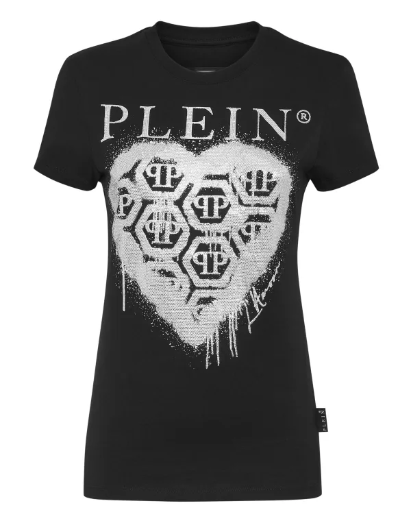 Verfraaid Er is niet veel voor nodig om van een T-shirt een must-have te maken. Wij raden dit T-shirt uit de Sexy Pure lijn aan. Het is gemaakt van katoenen jersey en heeft een opvallende print met strass-steentjes en de saffiaanleren patch met de PP Hexagon op het passtuk genaaid. Zomen gestikt met twee naalden.