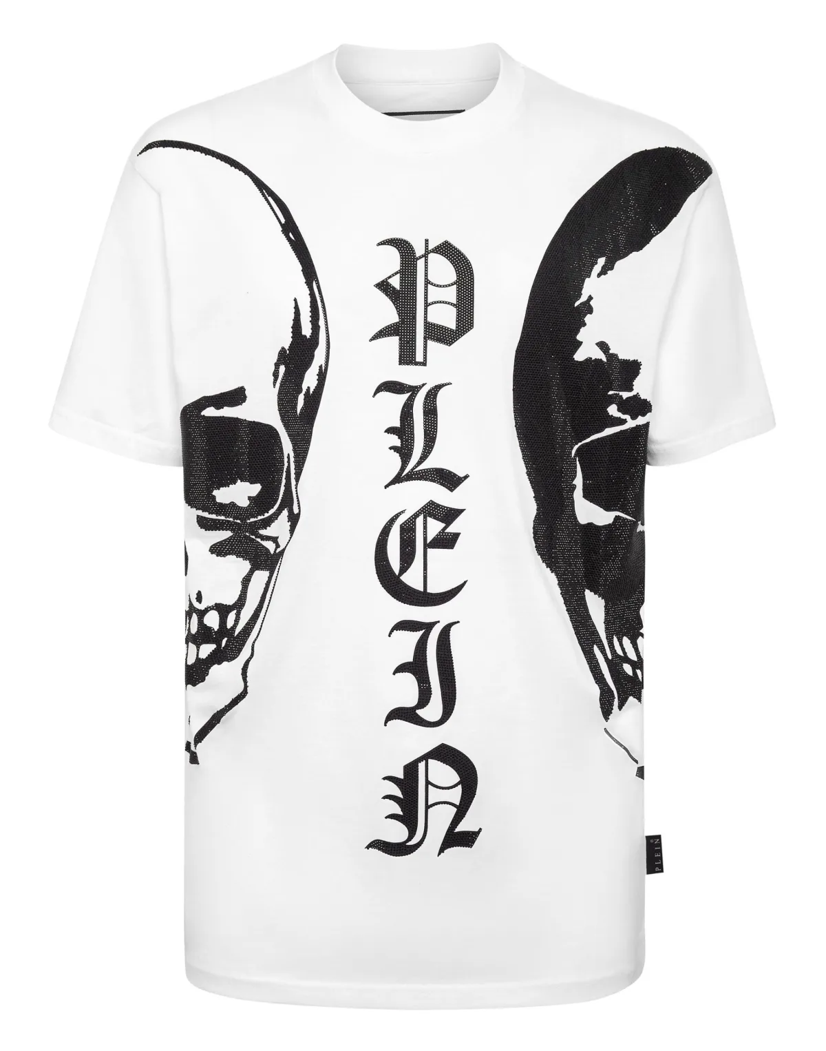 Verfraaid Kijk hoe dit katoenen jersey crewneck T-shirt wordt opgeschud. Het kledingstuk is voorzien van de iconische schedel met merk- en strasapplicaties. Een saffiaanleren patch met de PP Hexagon is op het juk genaaid. Zomen gestikt met twee naalden.