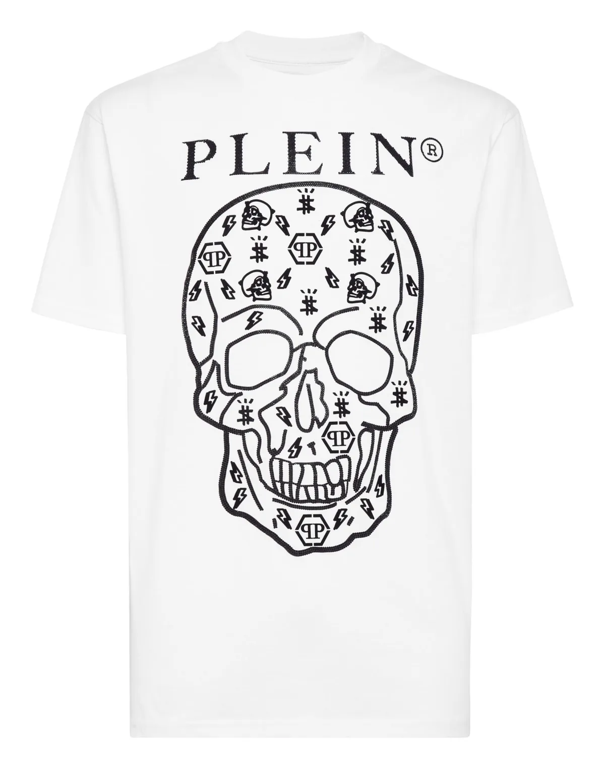 Verfraaid Kijk hoe dit katoenen jersey crewneck T-shirt wordt opgeschud. Het kledingstuk heeft de iconische doodshoofdprint met Brand glinsterende strasapplicaties en flockeffecten. Een saffiaanleren patch met de PP Hexagon is op het juk genaaid. De zomen zijn gestikt met twee naalden.