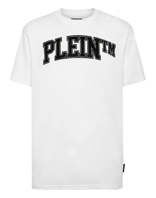 Verfraaid Kijk hoe dit katoenen jersey crewneck T-shirt wordt opgeschud. Het kledingstuk is voorzien van de iconische Brand print met strass-applicaties. Een saffiaanleren patch met de PP Hexagon is op het juk genaaid. De zomen zijn gestikt met twee naalden.
