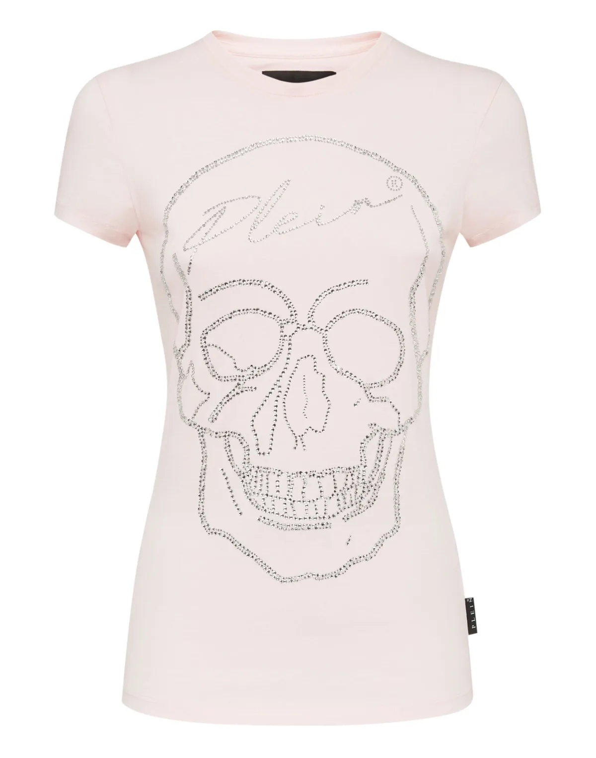 Verfraaid Een ontwerpdetail. Zie hoe dit katoenen jersey-shirt nieuw leven wordt ingeblazen door de iconische doodskop van strassteentjes. De saffiaanleren patch met de PP Hexagon is op het juk genaaid. Zomen gestikt met twee naalden.