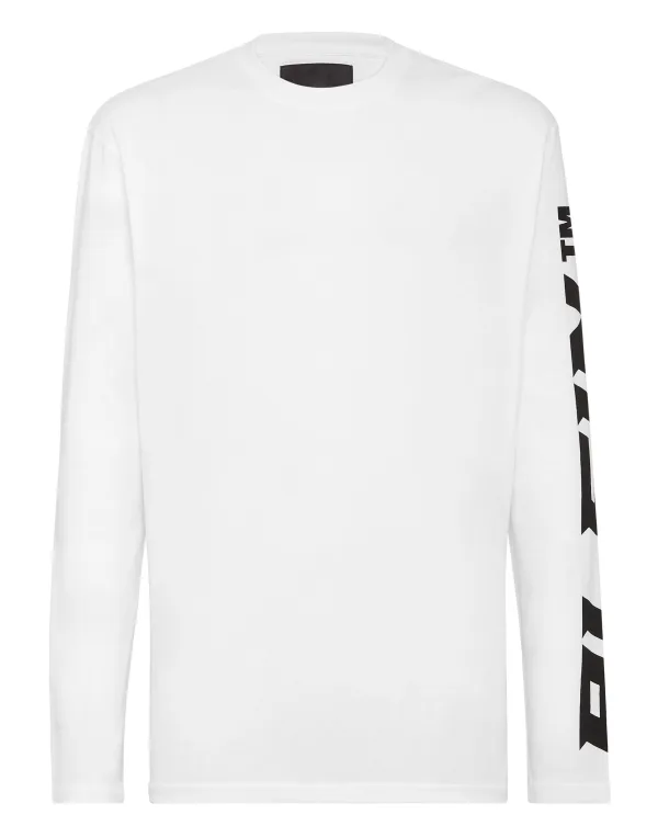 Katoenen jersey T-shirt met lange mouwen met Plein opdruk op de mouw. De saffiaanleren PP Hexagon is op het juk genaaid. Geribbelde halslijn. Zomen gestikt met twee naalden.