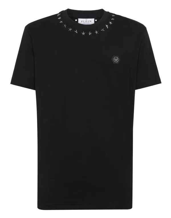 Add a dash of uniqueness to your outfits with this exclusive cotton T-shirt. Look at the details. Cotton jersey Star studs on round collar PP Hexagon on a saffian leather patch is sewn at left chest Rib knit neckline Two needle stitching