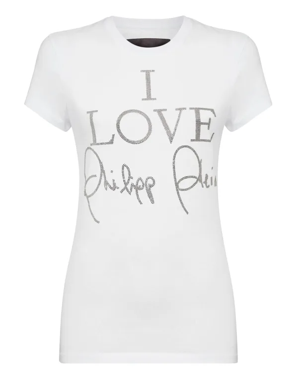 Katoenen T-shirt van jersey. De iconische Plein-handtekening van strassteentjes siert het item. Een saffiaanleren patch met de PP Hexagon op het juk genaaid. Zomen gestikt met twee naalden.