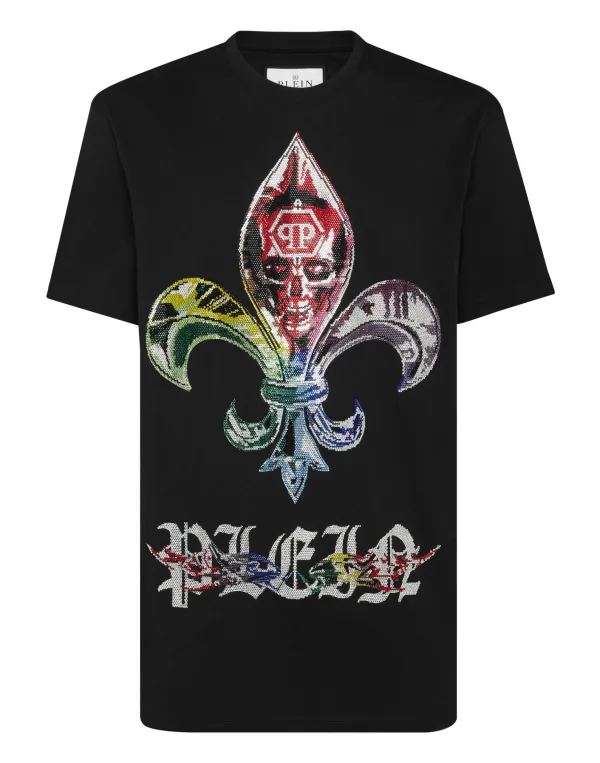 Voeg een vleugje uniciteit toe aan je outfits met dit katoenen T-shirt. Bekijk de details. Katoenen jersey Fleur-de-lis en doodskop met juwelen in chroomprint PP Hexagon op een saffiaanleren patch op het juk Ribgebreide hals Stiksels met twee naalden