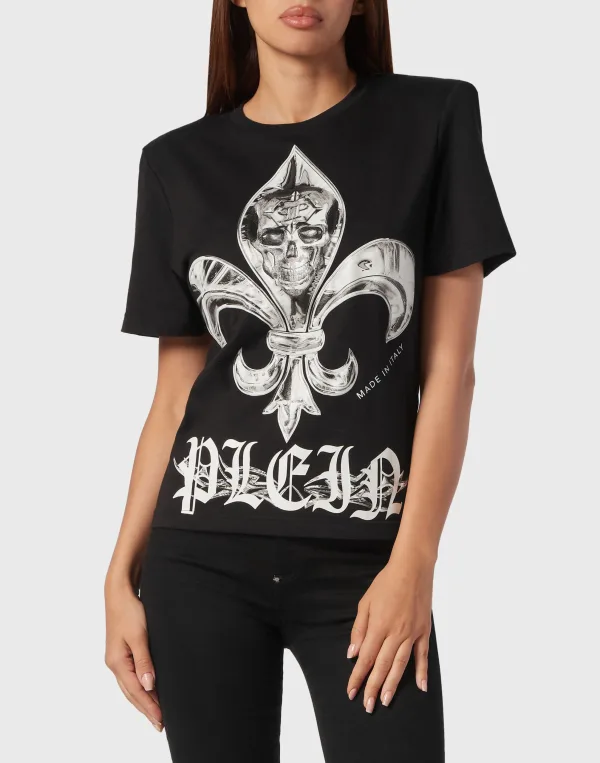 Voeg een vleugje uniciteit toe aan je outfits met dit katoenen T-shirt. Bekijk de details. Katoenen jersey Fleur-de-lis en doodskop met juwelen op chroom Gewatteerde schouders PP Hexagon op een saffiaan lederen patch genaaid op het juk Ribgebreide hals Twee naaldstiksels