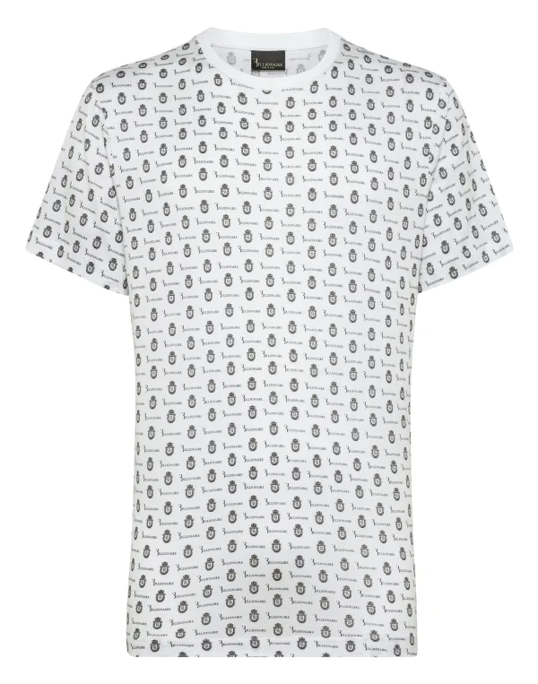 The emblem identifying Billionaire's collections can also become a decoration, like on this finest cotton jersey T-shirt, where it is printed all over together with the brand's lettering. Contrasting woven ribbed neckline. Two needle stitching hems.