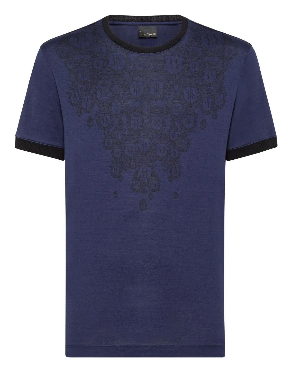 The emblem identifying Billionaire's collections can also become a decoration, like on this finest cotton jersey T-shirt, where it is replicated several times in different sizes. The brand's monogram is embroidered on the hanging loop at yoke. Two slits at bottom. Contrasting woven ribbed neckline and cuffs. Two needle stitching bottom hem.
