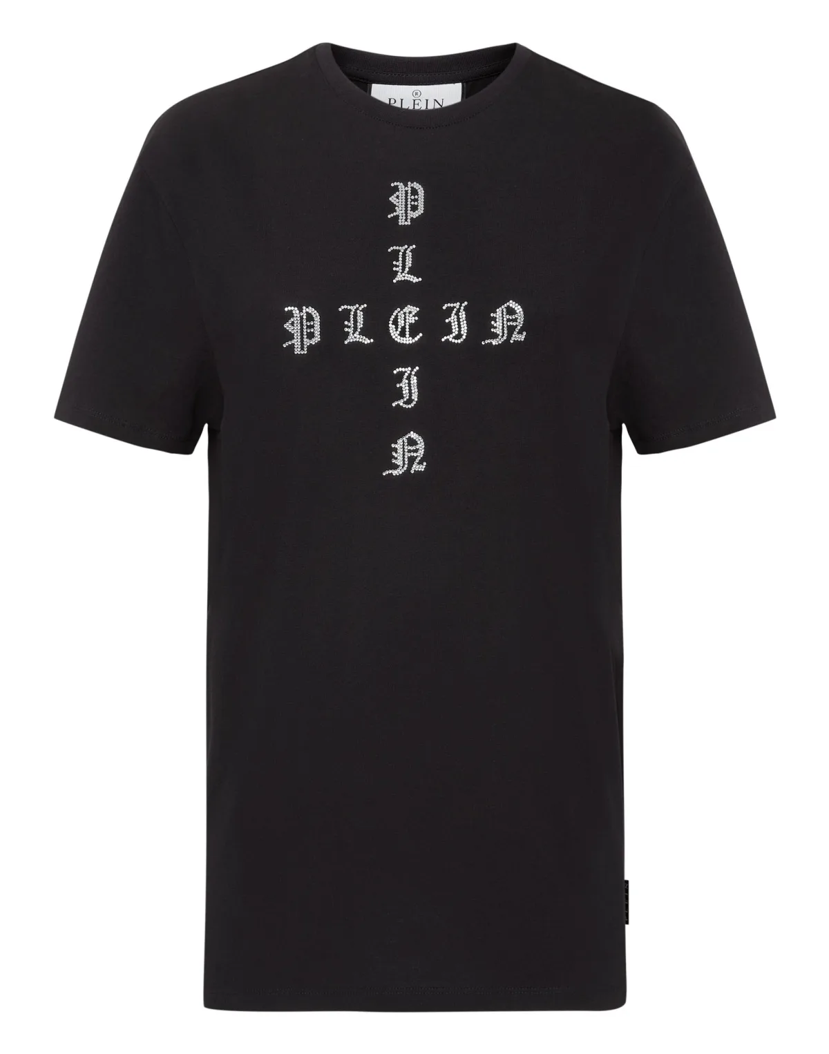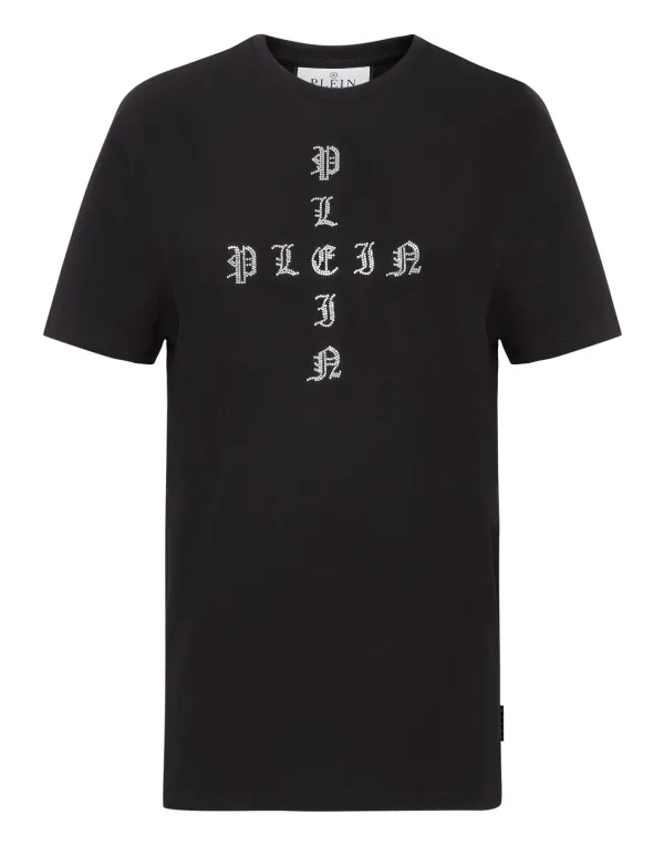 Verfraaid Ontdek de originaliteit van dit katoenen T-shirt met alle iconische elementen van het merk. Katoenen jersey Bejewelled Gothic Plein prints op de voor- en achterkant Ribgebreide hals Tweenaalds stiksels Pasvorm: Over