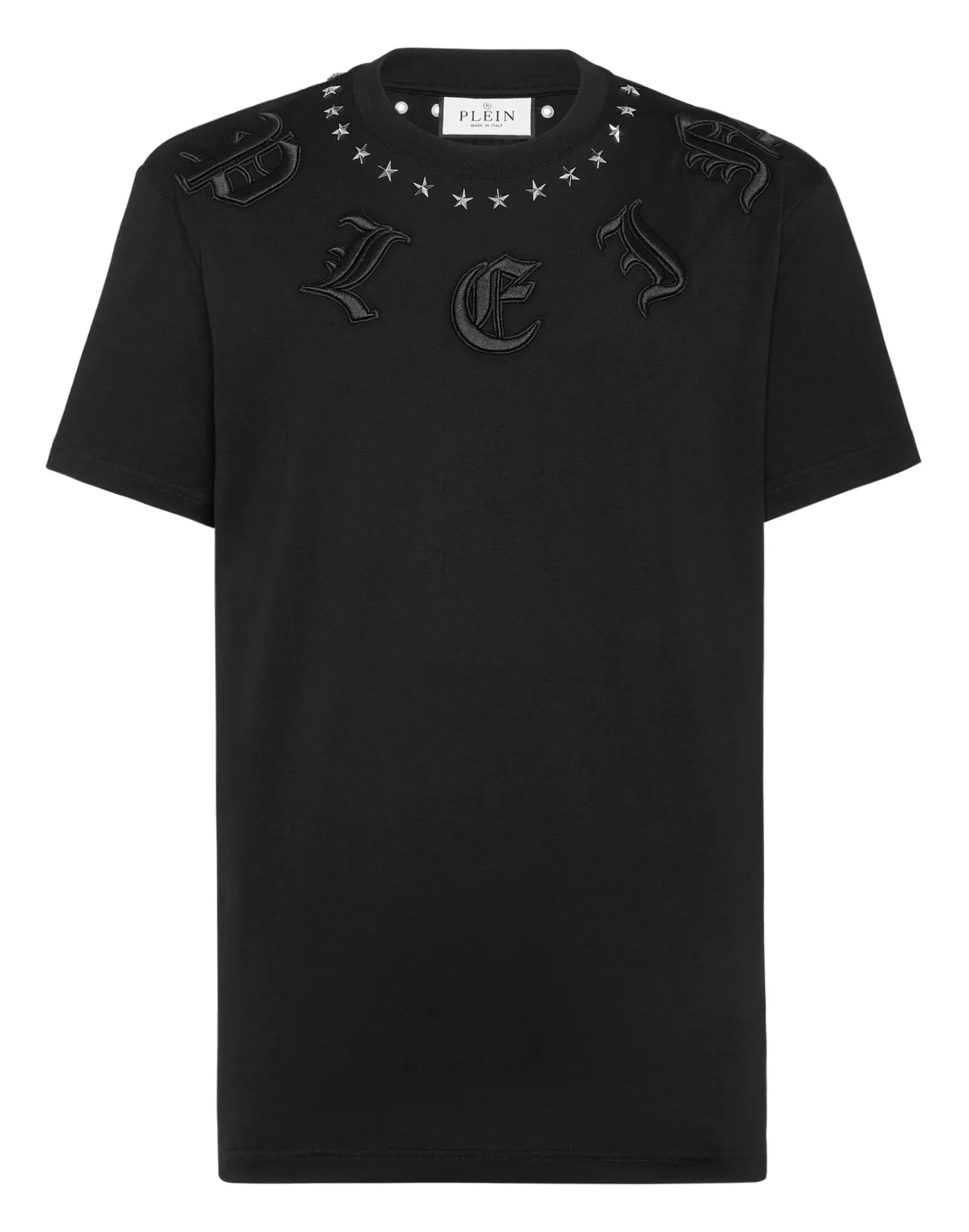 A plain T-shirt may also embody uniqueness and style. Check out this cotton jersey version with unique and outstanding details. Cotton jersey Brand lettering embroidered around the collar Star studs applications PP Hexagon Logo on a saffian leather patch is sewn at left chest Rib knit neckline Two needle stitching