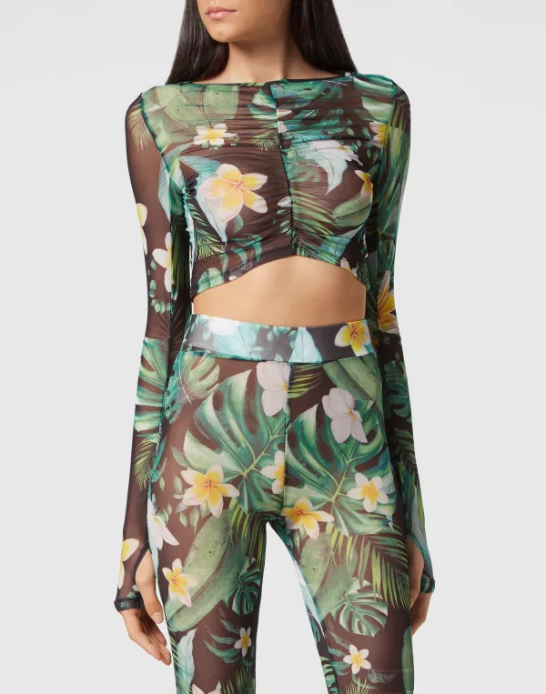 Vier je sensualiteit met deze top van stretch tule met bloemenprint Jersey van stretch tule met Hawaï bloemenprint Duimgat Verticale naden met plooien in het midden Stiksels met twee naalden Pasvorm: Bijgesneden