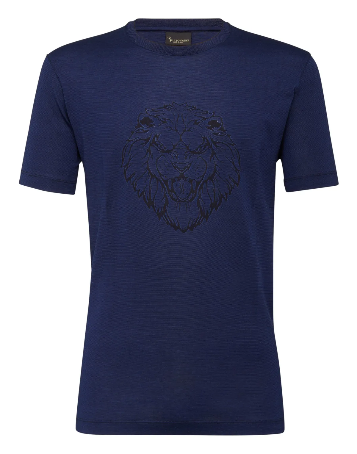 The lion, iconic symbol of Billionaire, is the precious engraved decoration on front of this stretch cotton jersey T-shirt. Ribbed neckline. Two side slits. Two-needle stitching on both cuffs and bottom hem.