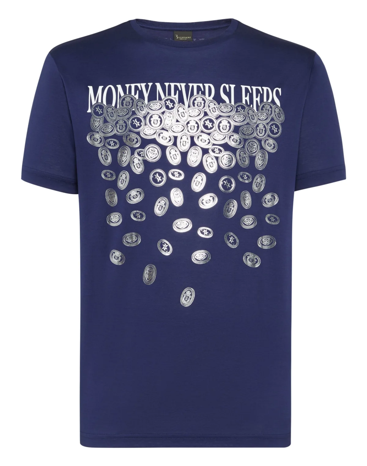 Op de voorkant van dit katoenen T-shirt van jersey staan verschillende gelamineerde munten en de letters van het merk. Op het juk staat een opvallende zin. Ribgebreide halslijn. Manchetten en onderkant gestikt met twee naalden. Twee zijsplitten aan de onderkant.