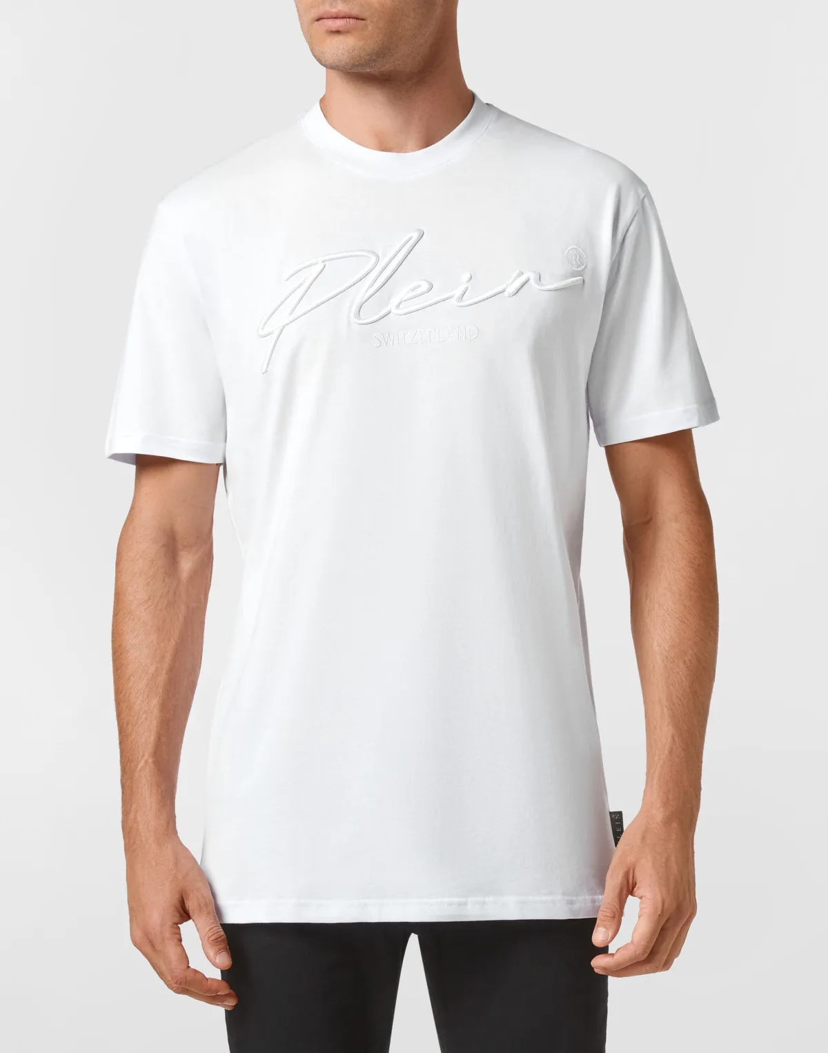 Katoenen T-shirt van jersey met de Plein-handtekening op de voorkant. Een nieuw leren label is op het juk genaaid. Omgeslagen manchetten. Stiksels met twee naalden.