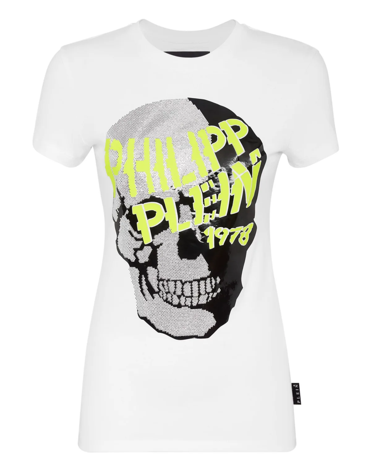 Verfraaid De iconografie van Maison Plein wordt geïdentificeerd door de iconische schedel die elk nieuw seizoen in nieuwe en originele versies wordt ontworpen. Op dit T-shirt van stretchkatoen jersey is het bedrukt met de letters van het merk en aan de voorkant voorzien van een rubberen effect en versierd met strassteentjes. Het zeshoekige logo is op het juk genaaid. Geribbelde halslijn. Zomen gestikt met twee naalden.