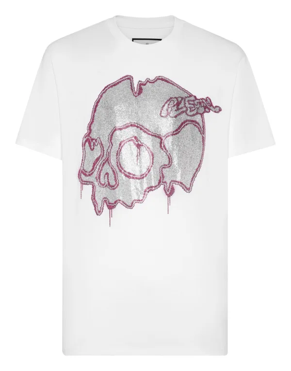 Verfraaid Voeg een vleugje uniciteit toe aan je outfits met dit exclusieve katoenen T-shirt. Bekijk de details. Katoenen jersey Druipende doodshoofdprint met strass-steentjes op beide voorkanten PP Hexagon op een saffiaanleren patch is op het juk genaaid Ribgebreide hals Twee naaldstiksels