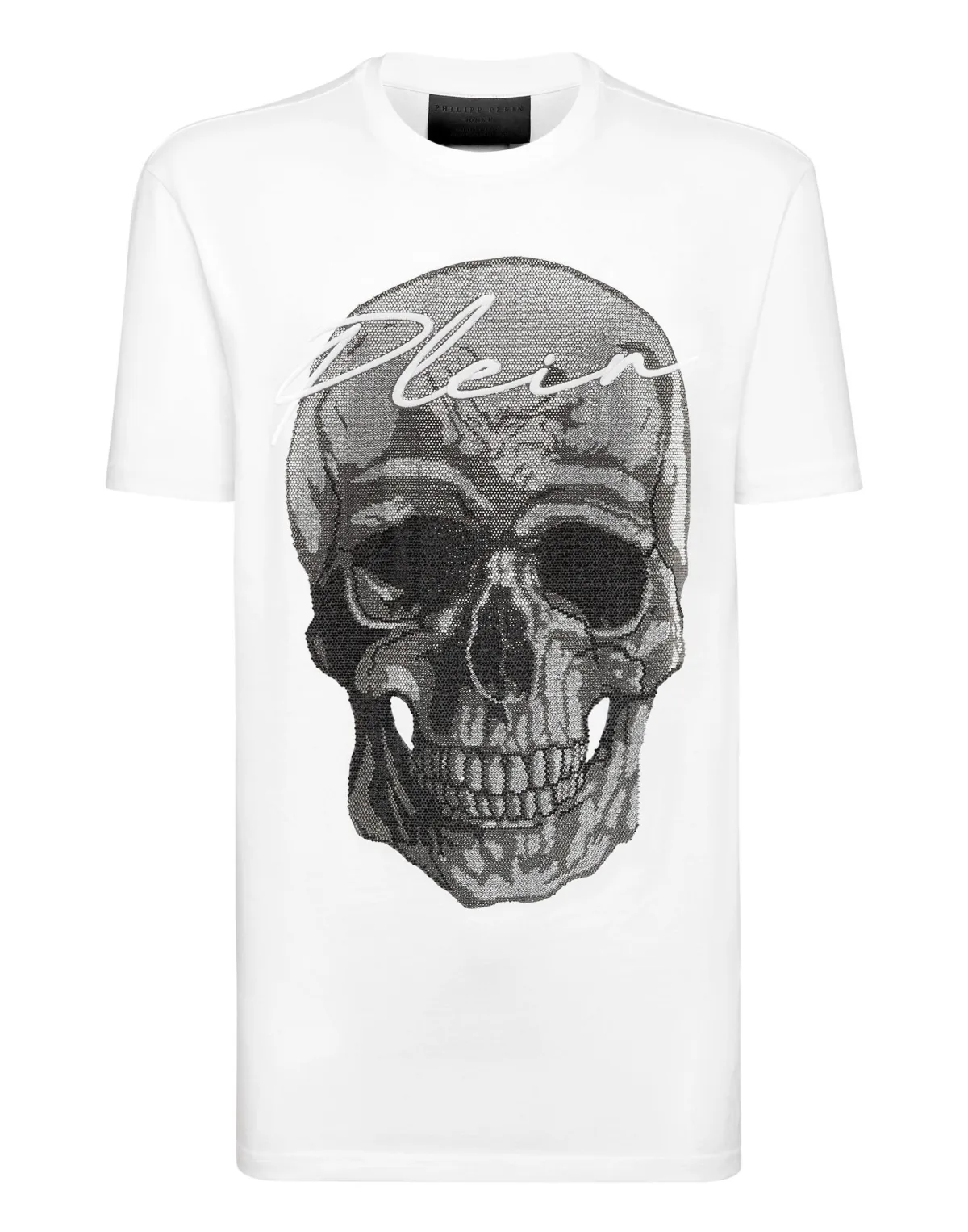 Verfraaid Katoenen T-shirt van jersey. De iconische doodshoofdprint met strassteentjes siert het kledingstuk. Een badge met het logo is op het juk genaaid. Zomen gestikt met twee naalden.