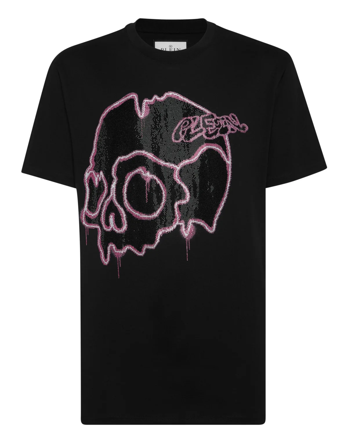 Verfraaid Voeg een vleugje uniciteit toe aan je outfits met dit exclusieve katoenen T-shirt. Bekijk de details. Katoenen jersey Druipende doodshoofdprint met strass-steentjes op beide voorkanten PP Hexagon op een saffiaanleren patch is op het juk genaaid Ribgebreide hals Twee naaldstiksels