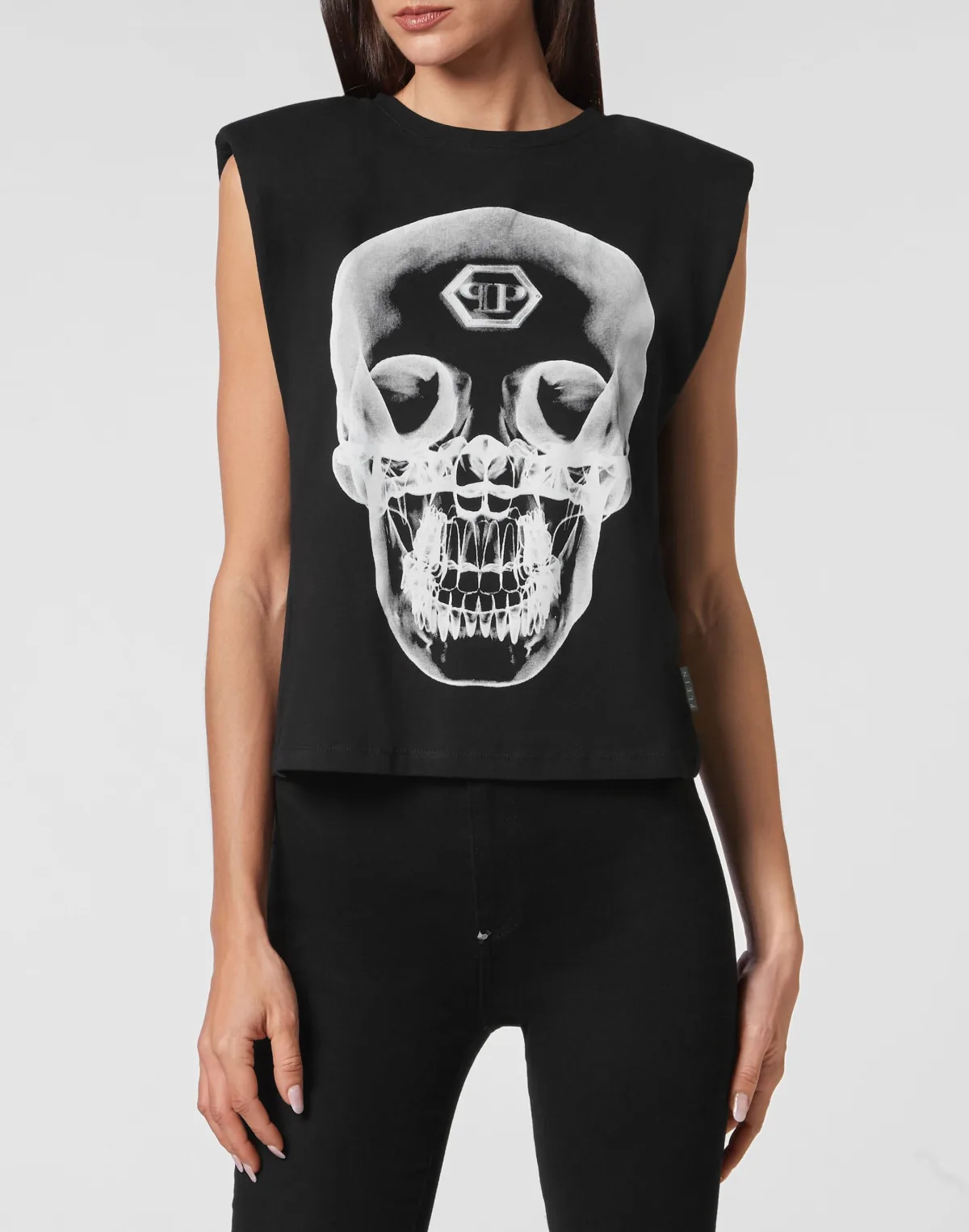 Een ontwerpdetail. Kijk hoe dit T-shirt van katoenen jersey nieuw leven wordt ingeblazen door de iconische Skull-print. Het is mouwloos en heeft paddings om de schouderlijn te accentueren. Zomen gestikt met twee naalden.