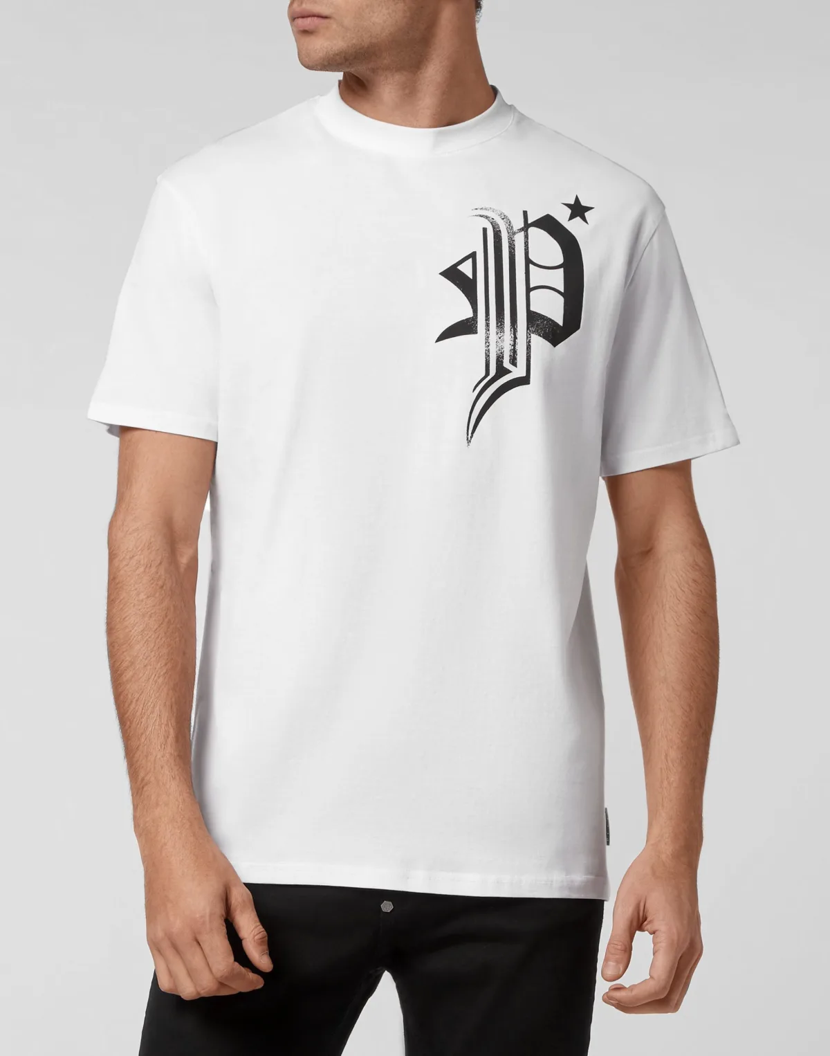 Kijk hoe dit katoenen crewneck T-shirt wordt opgeschud. Het kledingstuk is bedrukt met het merklogo en de iconische Skull&Bones. Een saffiaanleren patch met de PP Hexagon is op het juk genaaid. Zomen gestikt met twee naalden.