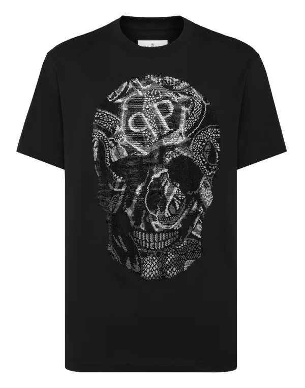 Voeg een vleugje uniciteit toe aan je outfits met dit exclusieve katoenen T-shirt. Bekijk de details. Katoenen jersey De iconische strass Skull print op de voorkant PP Hexagon op een saffiaan lederen patch is genaaid op het juk Ribgebreide hals Twee naaldstiksels