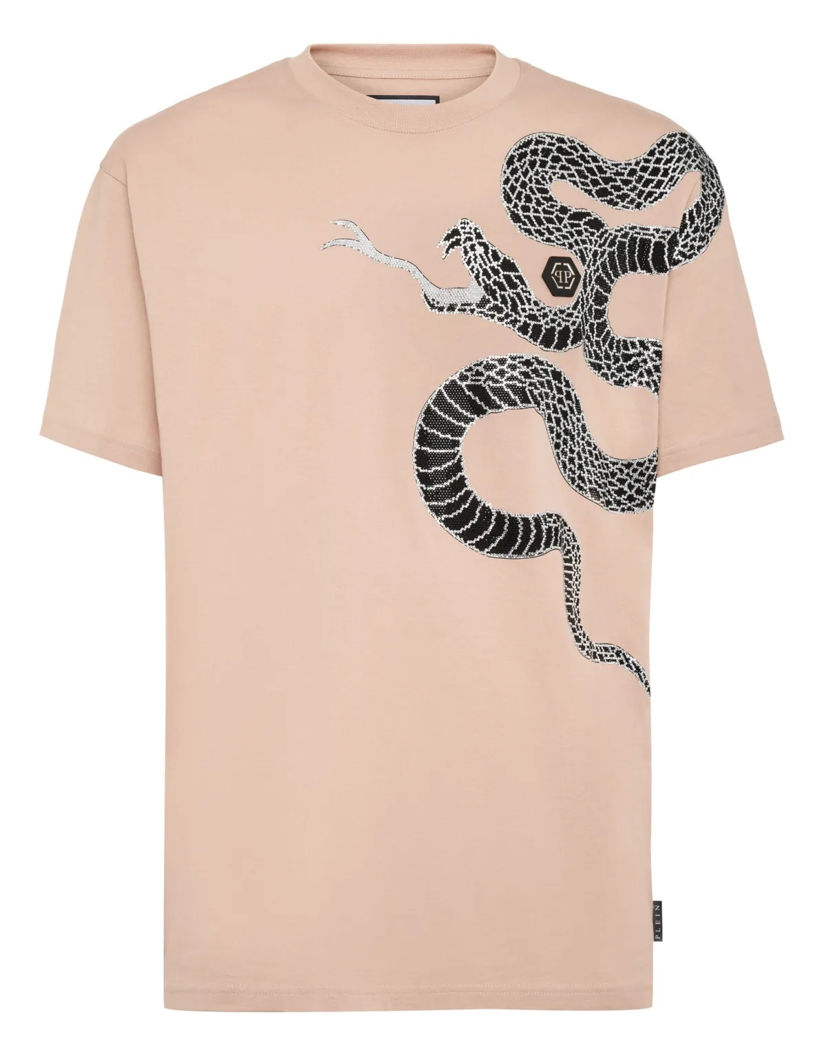 Ontdek de originaliteit van dit katoenen jersey T-shirt met korte mouwen, versierd met bijzondere patronen. Katoenen jersey Een met juwelen versierde slang siert de voorkant en de linkermouw PP Hexagon op een saffiaan lederen patch is genaaid op de linkerborst Ribgebreide hals Stiksels met twee naalden