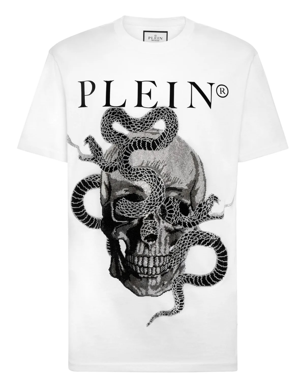 Ontdek de originaliteit van dit katoenen jersey T-shirt met korte mouwen versierd met bijzondere patronen. Katoenen jersey Een print toont twee slangen die zich verstrengelen tussen de iconische Skull en Brand PP Hexagon op een saffiaan lederen patch is genaaid op het juk Ribgebreide hals Twee naaldstiksels