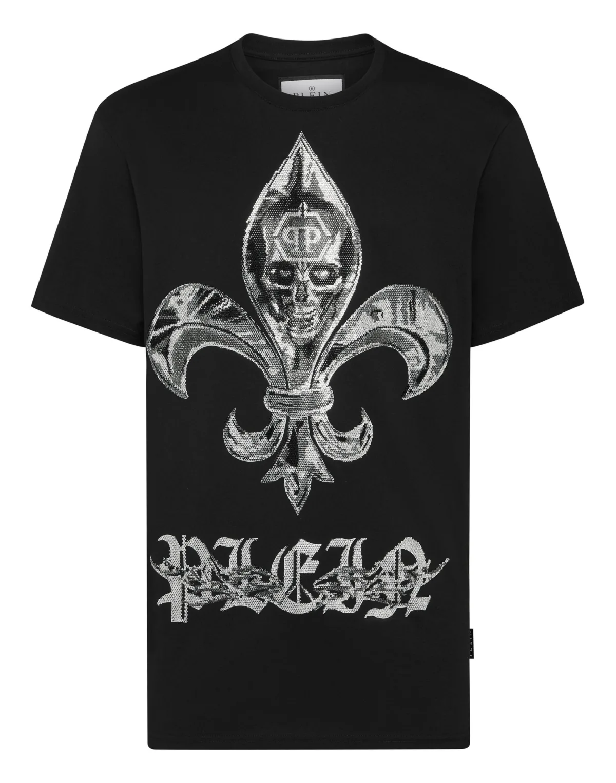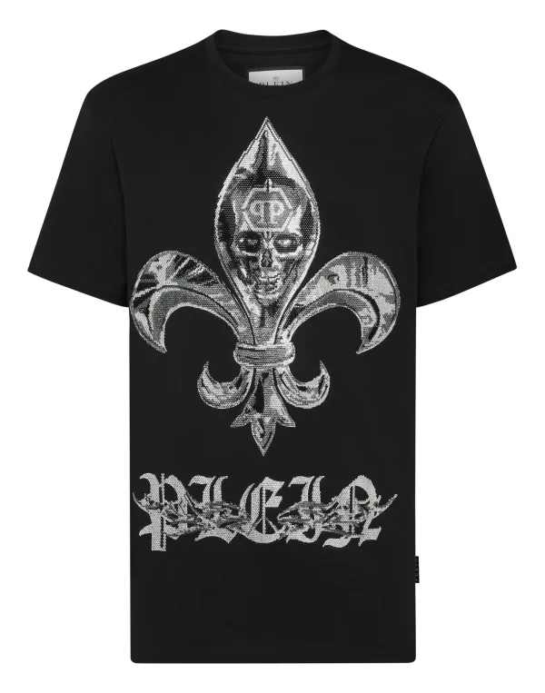 Voeg een vleugje uniciteit toe aan je outfits met dit katoenen T-shirt. Bekijk de details. Katoenen jersey Fleur-de-lis en doodskop met juwelen in chroomprint PP Hexagon op een saffiaanleren patch op het juk Ribgebreide hals Stiksels met twee naalden