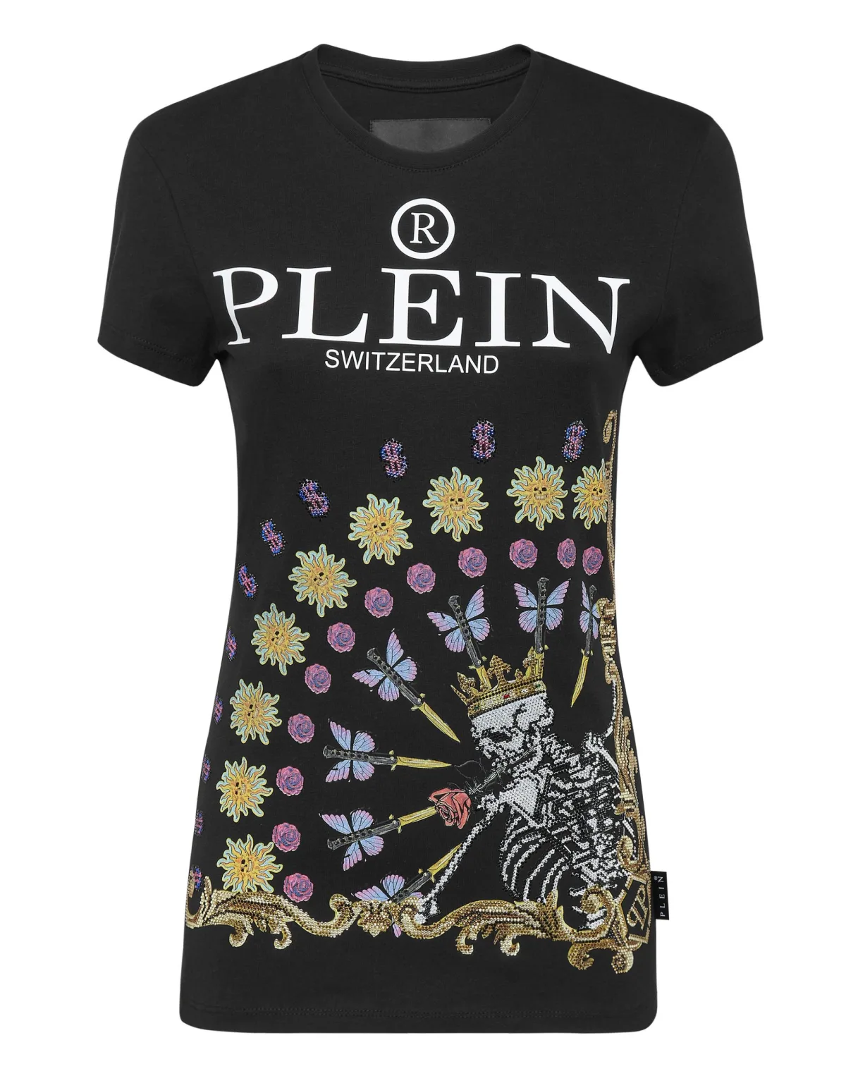 Verfraaid Kijk hoe dit T-shirt van katoenen jersey nieuw leven wordt ingeblazen door de print met het Flower Skull-thema. De saffiaanleren patch met de PP Hexagon is op het juk genaaid. Zomen gestikt met twee naalden.