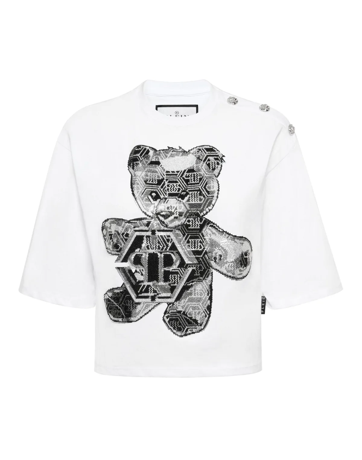 Dit T-shirt met ronde hals is speels en toch onmiskenbaar stoer. Het combineert luxe vakmanschap met een vleugje streetwear attitude. Gemaakt van zacht, ademend katoen voor de hele dag comfort. 3D teddy graphic met ingewikkelde glazen details voor een opvallende look. Gecropt silhouet voegt een modern, fashion-forward randje toe. Schouderknoopaccenten voor een verfijnde, stijlvolle touch. Perfect om te combineren met hoog getailleerde denim of gelaagd over een strakke bodysuit.