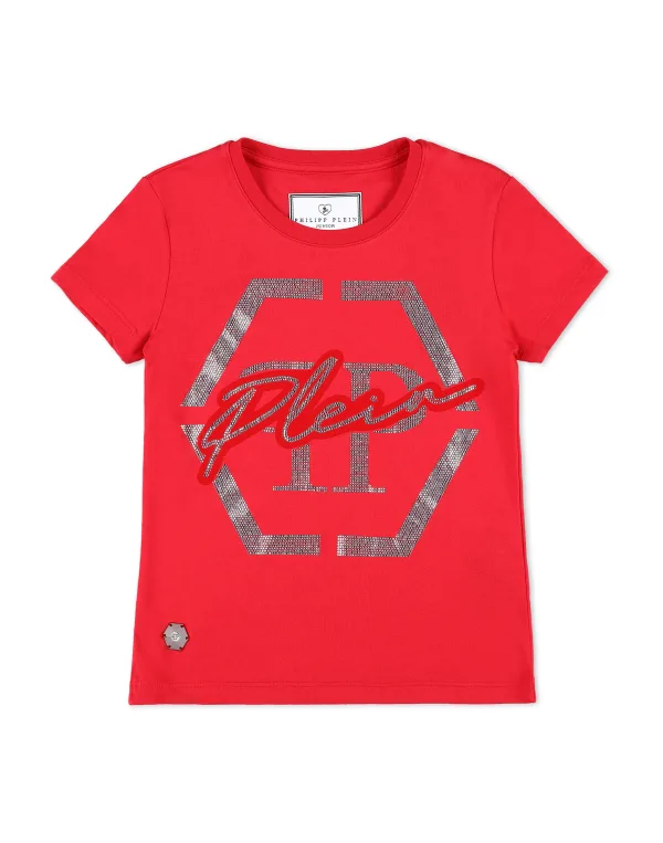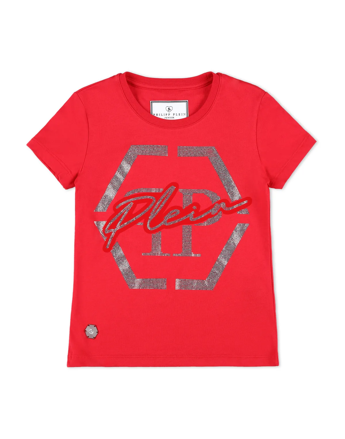The brand’s iconic elements decorated with rhinestones on the front are the key feature of this cotton jersey T-shirt. Ribbed neckline. Two needle stitching hems.