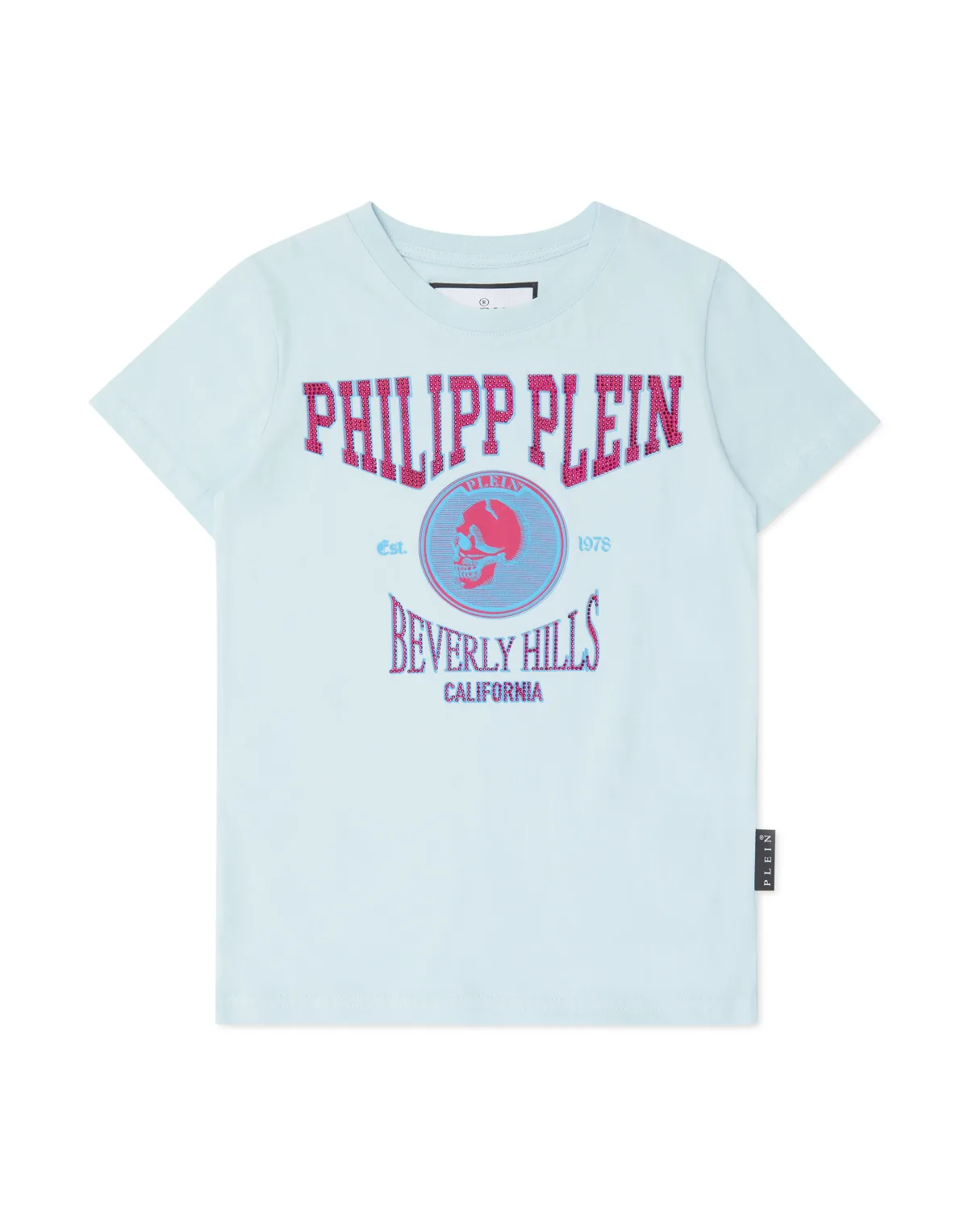 Check out this exclusive cotton T-shirt created with special prints and décor. Look at the details. Cotton jersey Bejeweled Lettering and pattern print on the front PP Hexagon on a saffian leather patch sewn at yoke Rib knit neckline Two needle stitching