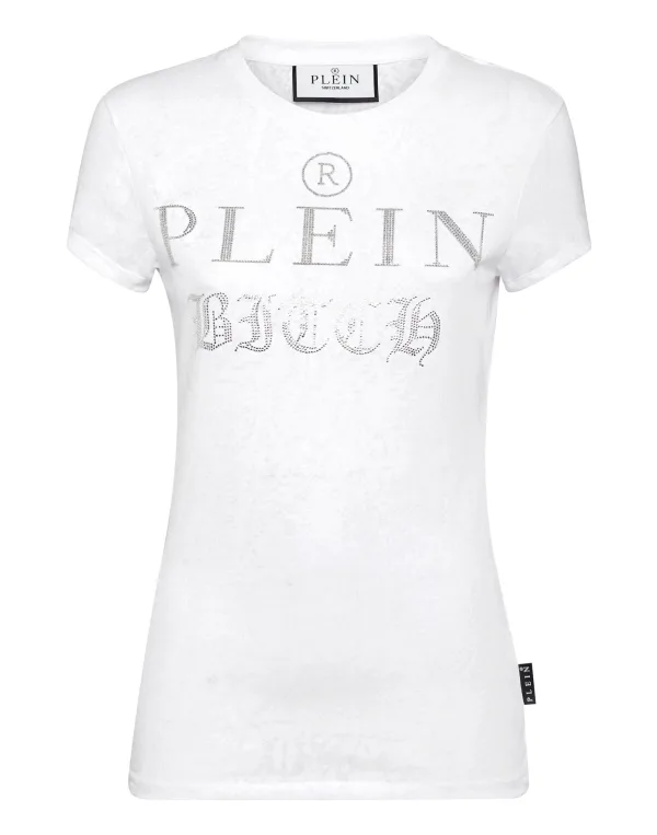 Dit getailleerde T-shirt is een onverbloemde verschijning met een gestroomlijnd silhouet en opvallende, met kristallen versierde letters. Ontworpen om een statement te maken, dag of nacht. Voorgevormde pasvorm zorgt voor een zelfverzekerde, vrouwelijke vorm Met kristallen versierd "Plein Bitch" artwork voor maximale impact Lichtgewicht gevoel voor moeiteloze styling Perfect te combineren met scherpe kleding, denim of leer Ideaal voor gedurfde off-duty of uitgaanslooks