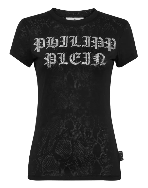 Verfraaid A design detail. See how this cotton jersey T-shirt is transformed by bejewelled prints. Cotton jersey The iconic Brand bejewelled print on the front PP Hexagon on a saffian leather patch sewn at yoke Rib knit neckline Two needle stitching